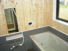 浴室は、桧とタイル、コルク床で安全に暖かく。